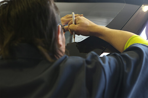 車のウィンドウのサイズや形に合わせて、カットする為の下線を描いていきます。この工程は手作業で行っていきます。