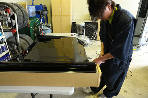 ヘラを使用し、フィルムの中にある水分や気泡などを丁寧に除去していきます。この工程が重要になるので、丁寧に確実に仕上げていきます。